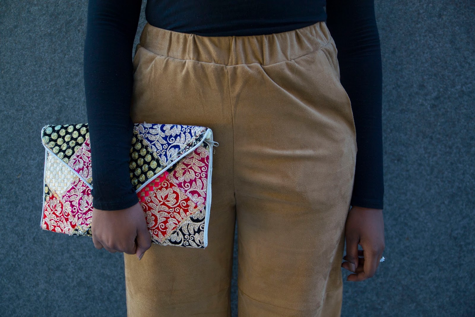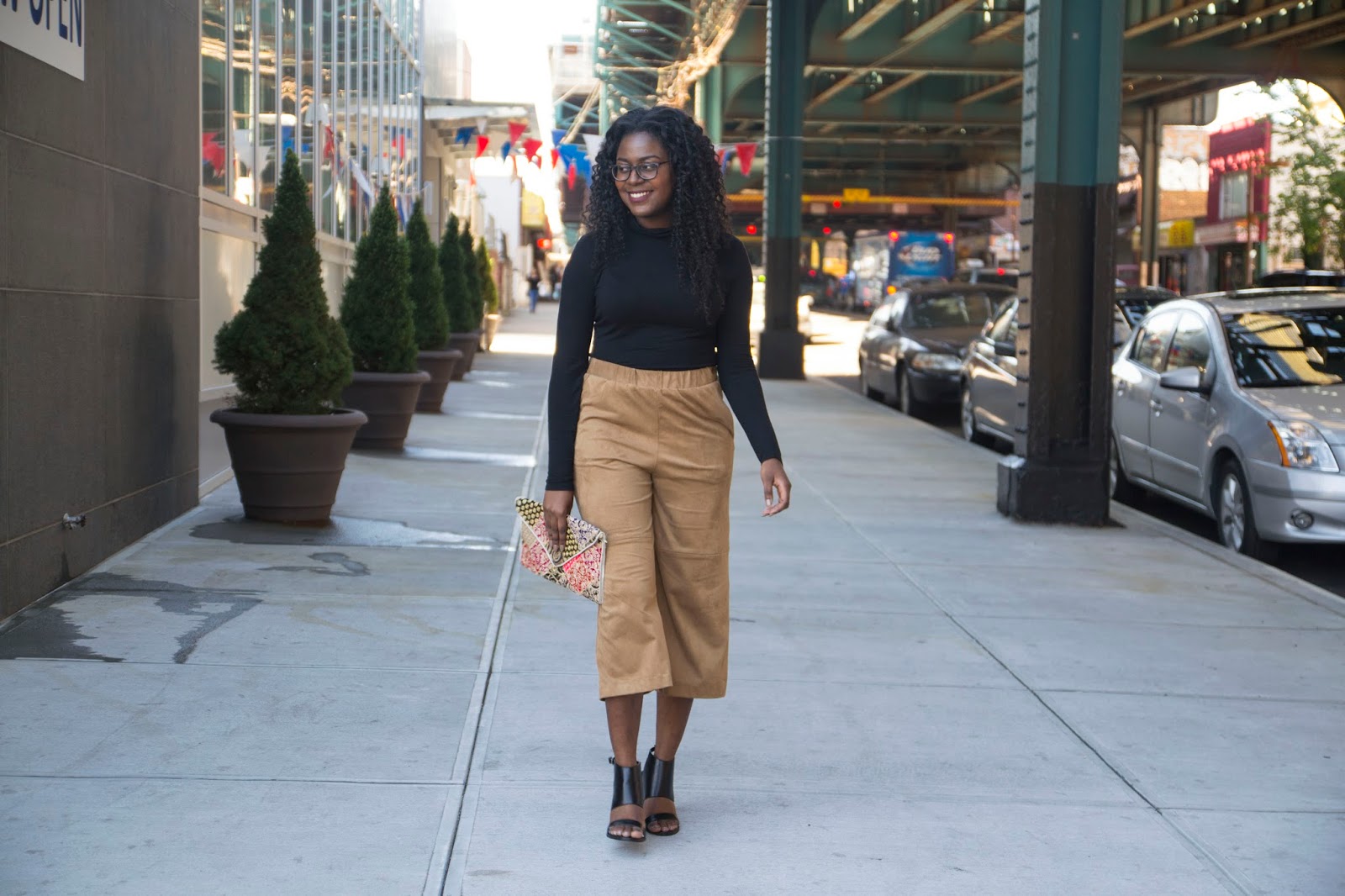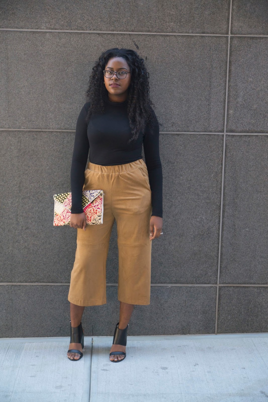 I wore this look this past weekend while I was in New York City for College Fashion Week (click here to check out my experience at CFW). The culottes were perfect for the occasion because they allowed me to move throughout the venue with no problem because of their light and airy shape. I paired it with a black turtle neck to keep the outfit sleek and simple. While I would have preferred to wear long boots I went with my favorite chunky black heels. My pop of print and color was through my gorgeous clutch that was gifted to me by my best friend Dana while she was studying abroad in Spain. I absolutely love the detailing and can’t wait to pair it with another look!