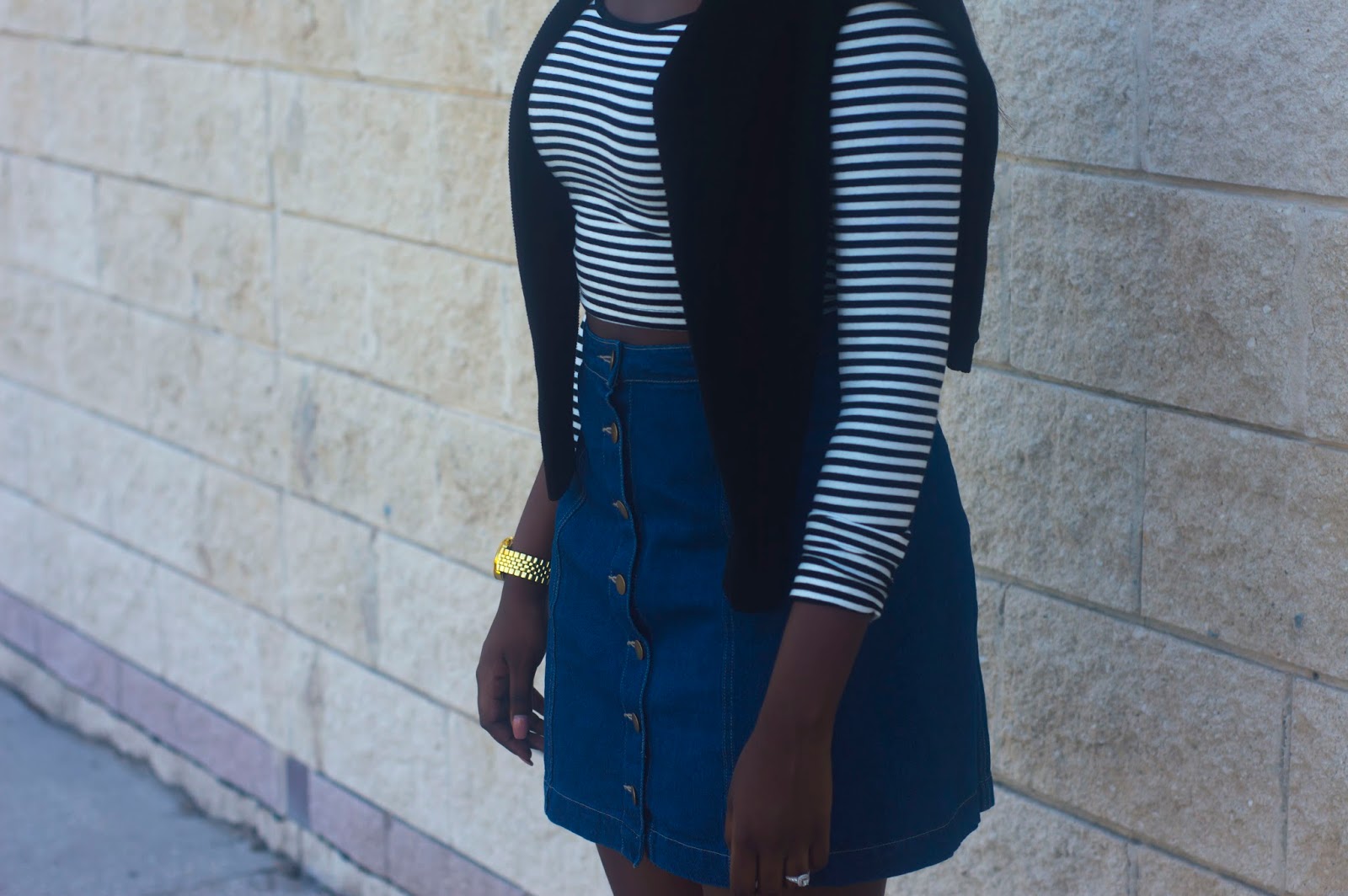 So lets get into the details about my look for today. The skirt that I’m wearing is by far one of my favorite skirts this season. The color of the denim is perfect for Fall/transitioning out Summer outfits and I love the front button detailing along with the length. I picked this up from Charlotte Russe and got it for a great price which made my heart even more happy. I was also in a striped mood today (but didn’t want to get engulfed in heat) so this cropped top from Forever21 was pretty appropriate. I draped the sweater across my shoulders, in a very preppy fashion I might add, because I simply couldn’t wear it normally so I decided to make it the third piece in my look. The H&M boots are one of my favorite pairs of shoes and I paired it with black comfy socks to give the look a more Fall vibe. Although black & white looks are slowly becoming my thing, I had to add a little pop of print through my sunnies.