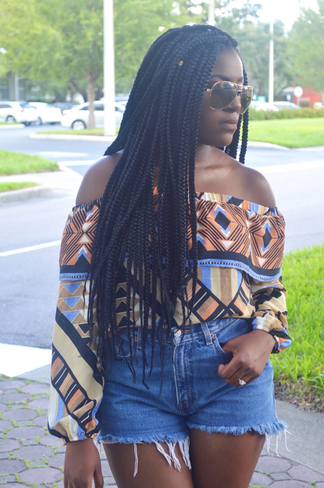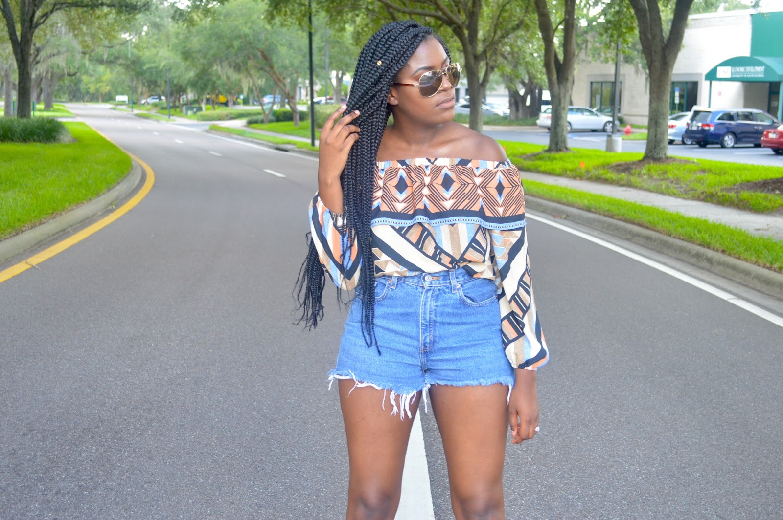 Every season us trend loving babes are always on the hunt to find ways to incorporate the seasons must have pieces into our wardrobe. Whenever I think of the Summer time I always think of a nice pair of shorts, trendy loose fitting tops, and cute sunglasses (hence my look for today). The off the shoulder top has taken this season by storm and can pretty much be found in every retail store as well as every bloggers closet.