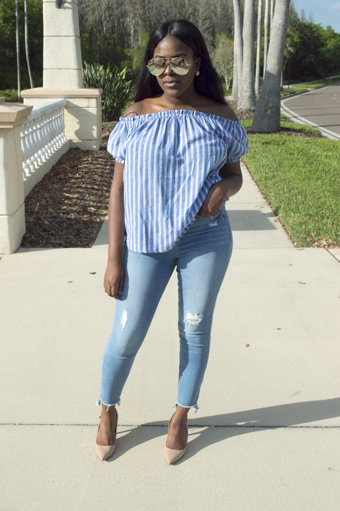 fave off the shoulder top and jeans. I scored the top from Ross, for 7 bucks I might add, and my oversized sunnies from SunglassSpot for $5. I love being able to purchase current season trends for great prices because it allows minimal investment for awesome pieces.